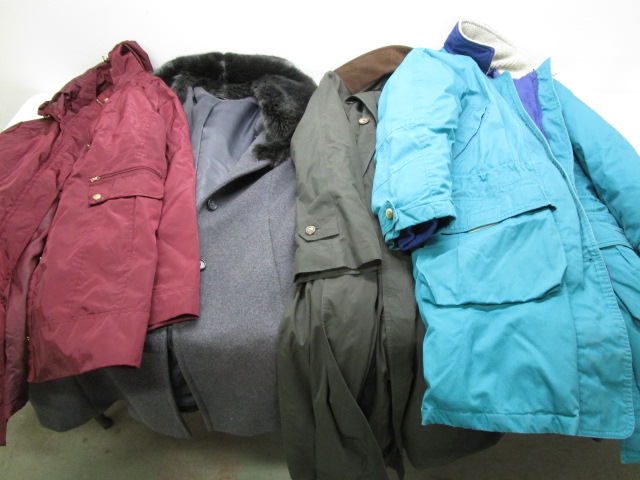 This assortment of coats includes three car coat length woman's coats (size small, large and 14) and a Ralph Lauren lined long green coat. These items are in previously owned condition. Please preview.