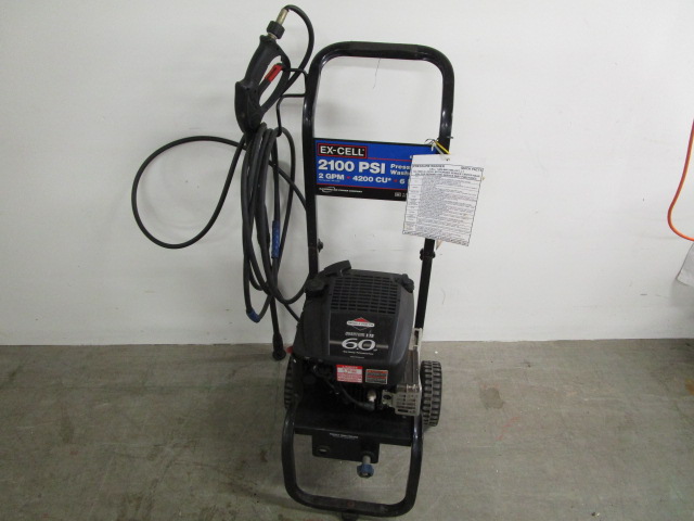 Ex-Cell 2100 PSI Pressure Washer. 2gpm, 4200 cu* and 6hp. Unit is used, gas powered, cord pulls freely to motor, but has been stored away. Unknown life expectancy, please preview.