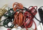 Assorted Industrial power extension cords with a Rayovac charging station for rechargeable batteries.