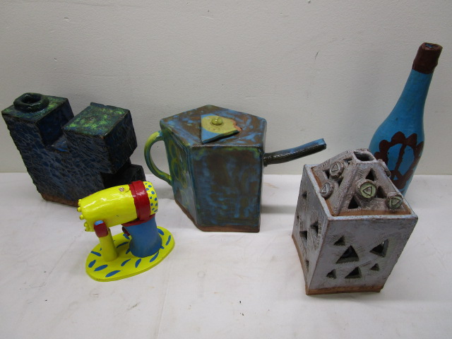 Interesting One of a Kind ceramic class objects. One is identified as a kettle and a covered bottle, the others are some type of vase and alien gun on holder. Eclectic grouping, very interesting. Please preview. Sizes are from 6 in to 10 in.