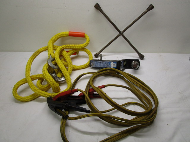 Reese towpower hitch with 2 inch ball, 3 and 1/4 inch drop, heavy duty tow nylon cable, cross lug nut wrench and jumper cables. Collection of tools are in very good usable condition, please preview.