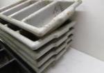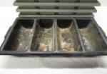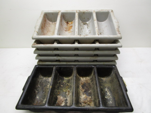 4-compartment commercial cutlery bins, likely from the brand Winco. 6 in all, gray and black in colors. Used but not damaged. They will clean up nicely. Each tray measures 21" x 11.5". Please preview.