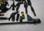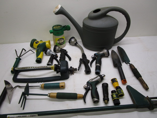 Garden yard tools including hound dog, the weed hound, plastic watering can, garden and Lawn feeder container, hose attachments and sprinklers with garden tools. All items are used but in good usable condition. Please preview.