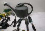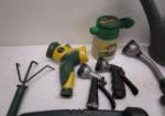Garden yard tools including hound dog, the weed hound, plastic watering can, garden and Lawn feeder container, hose attachments and sprinklers with garden tools.