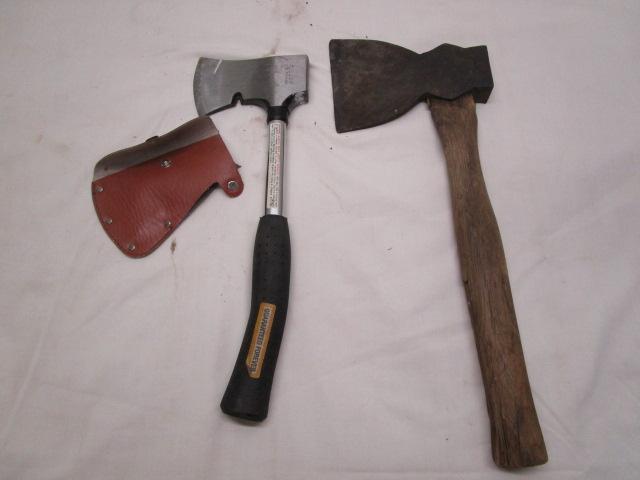 Vintage Early Stilletto Hatchet & Buffalo Camping Hatchet with Leather Blade Sheath. The early stiletto Hatchet is a highly sought after Hatchet and both are in good condition. Please preview.