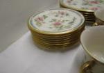 Gorgeous Lennox Morning Blossom China dish set. 33 pieces in all. Beautiful pink and blue floral pattern with gold trimming throughout. The set includes six 10-in dinner plates, 9 saucers with 10 teacups and six 8-in salad plates. Comes with an ivory set of shakers with a platinum trim, not gold. They are also Lenox. The set is in overall very good previously owned condition with no visual chips or cracks or crazing in the glazing. Please preview.