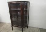 | Lovely antique solid oak Larkin Co. China cabinet featuring a curved glass design, four shelves and decorative claw and ball feet. |
