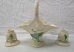 | Vintage Hull Art Pottery set consists of a basket vase and two matching candle holders in the Magnolia pattern, likely produced in the late 1940s. |