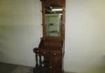 | Nice vintage hall tree featuring a mirror, four peg style hooks, a shelf, a built in umbrella stand and two drawers. |