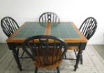 | Stylish wood dining room table set featuring a light wood finish, dark green (faux) tile style top and four Windsor-style chairs in a contrasting black finish. |