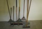 | Assortment of ten yard care tools including leaf rakes, garden rakes, a large push broom, a garden hoe and a three prong leaf rake. |