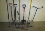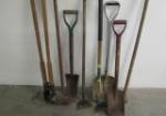 | Large collection of eight garden tools including a Craftsman post hole digger, a 14" drain spade/shovel, hoes, and garden shovels. |