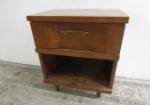 | Very nice mid-century modern walnut veneer night stand featuring a single drawer (with brass hardware) and an open "cubby" style storage area. |