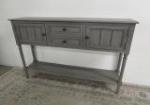 | Very nice grey sofa/hall table featuring two small drawers, two storage areas, nice hardware and a lower tier. |