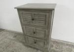 | Adorable three drawer side table featuring a louvered door design and nice hardware. |