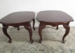 | Lovely pair of Queen Anne style cherry side tables featuring a carved motif. |