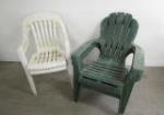 | Set of doll size outdoor furniture pieces including a 17" X 13" double Adirondack style chair and a 16" X 21" Adirondack style bench swing. |