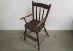 | Antique wooden child's high chair featuring a spindle back design. |