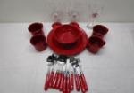 | Red metal enamelware dinner set, service for four includes red handled flatware set and three red-based Boston Red Sox wine glasses. |