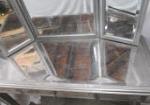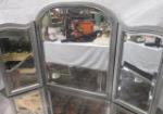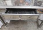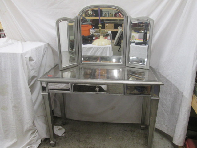 This one of a kind, home-made, (one drawer) mirrored vanity table with silver toned framing and mirror measures 42"W X 18"D X 31"H. The mirror measures 39"W X 24. This item is in used good condition. It is sturdy and the glass is in good condition but there are some scratches and one section of the mirror frame is cracked. Please preview.