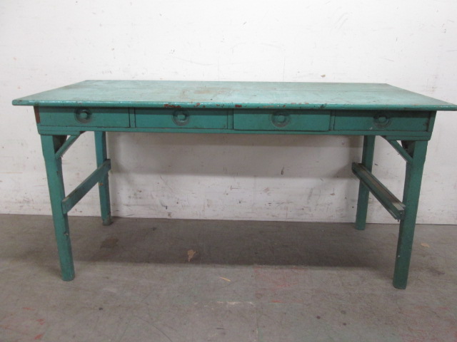 This vintage, sturdy, work table (or with a little T.L.C. could be used as a service table) has four drawers for storage. This item measures 54-1/2"L X 24"D X 28"H. This table is in vintage, used condition. Please preview.
