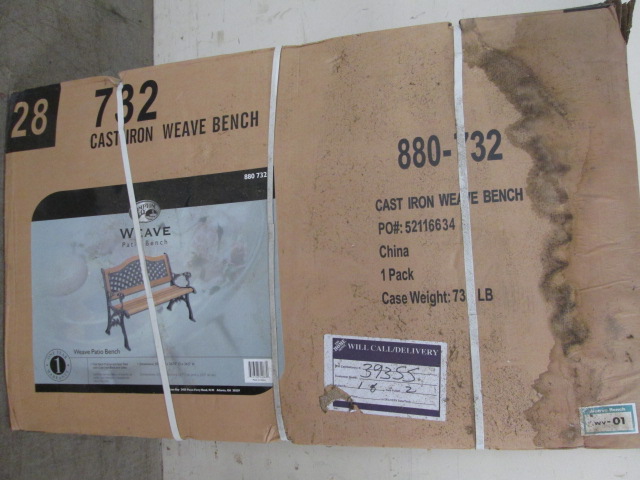 This new Patio Life brand cast iron and weave park style bench (model number 880-732) is in its original box. The box does have some miner water damage but has never been opened. Please preview.
