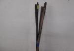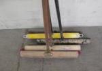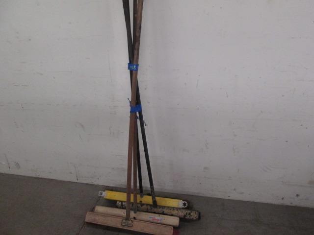 This assortment of four, long handled, push brooms includes a "Servistar" brand broom. These items are in used, good condition. Please preview.