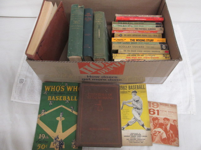 This collection of twenty two hardcover and paperback books includes sports related books, metalwork guides, and general literature. Titles include "The Duke of Flatbush", "The Wrong Stuff", Essentials Of Metalworking" and more. These books are in used condition. Please preview.