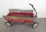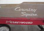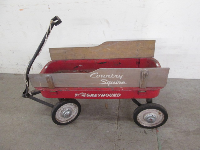 This adorable vintage Country Squire, Greyhound red wagon with safety slats on the side measures 42"L X 18"W X 6-1/2"H. This item is in vintage, used condition. Please preview.