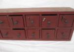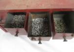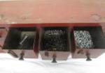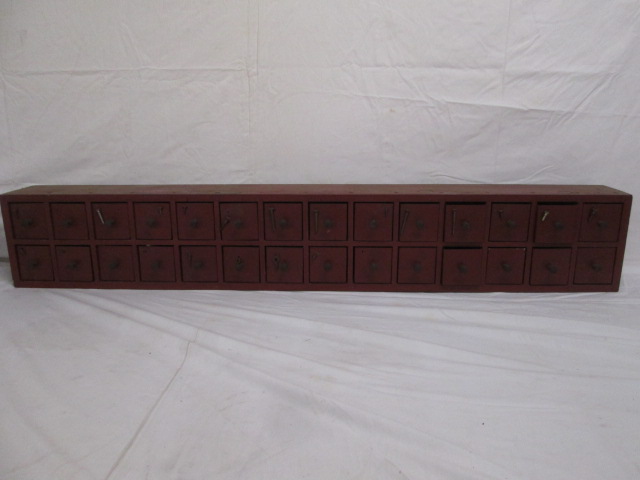 This vintage 28 drawer storage container was previously used for storing a variety of nuts, bolts and screws. This piece measures 48"W X 5"D X 8"H. Each drawer measures 3" X 3". This item is in used, good condition. Please preview.
