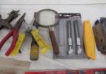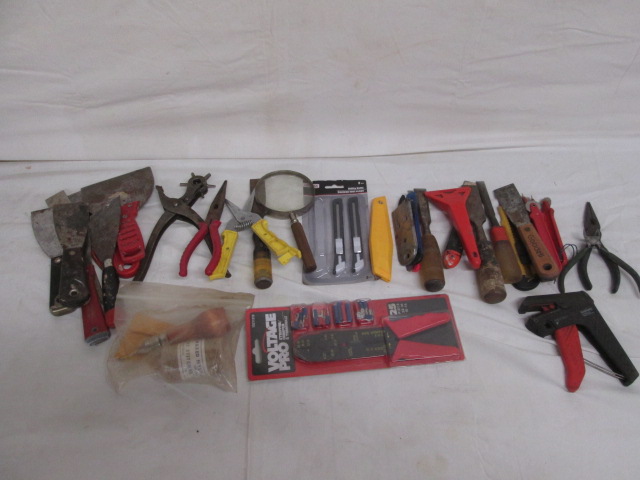 This selection of hand tools includes a (new) Voltage Pro wire stripper, utility knives, needle nose pliers, and more. These items are in used condition unless otherwise noted. Please preview.