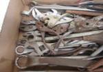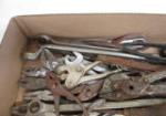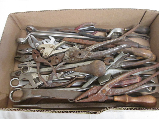 This box of tools includes wrenches, sheet metal pliers, screw drivers, files and more. These tools are in used condition. Please preview.