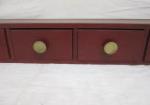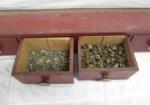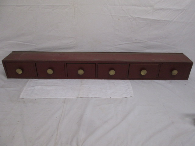 This nice burgundy, six drawer storage piece was previously utilized to store items such as nails, screws, and washers. Some of these items remain in the piece. This piece measures 47"L X 6"D X 6"H. Each drawer measures 7" X 5". This item is in used, good condition. Please preview.