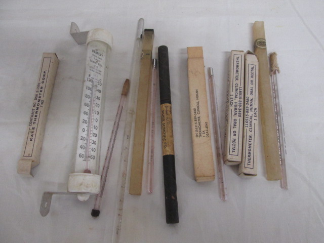 This collection of ten vintage thermometers include four Kaye oral/rectal thermometers, a Fisher Scientific Co. thermometer, four Friez Co. thermometers and more. These items are in vintage, good condition. Please preview.