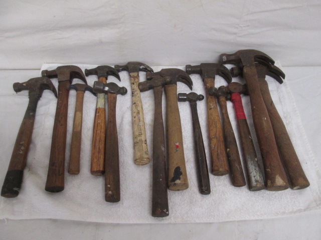 This selection of fourteen vintage hammers in various sizes and weights are in used, vintage condition. Please preview.