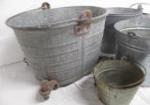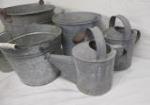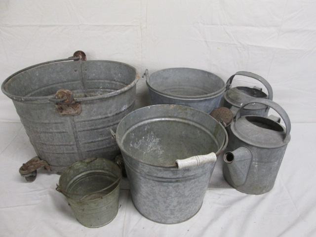 This assortment of six galvanized yard care items includes four pails (various sizes) and two vintage watering cans. These items are in used, good condition. Please preview.