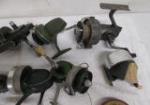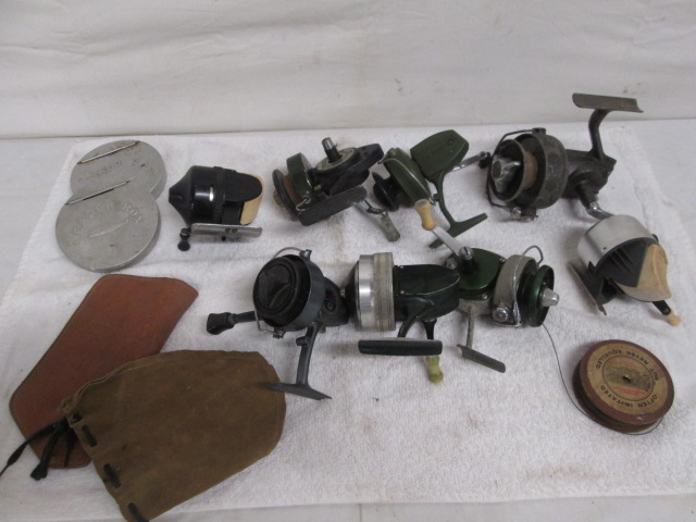 This collection of eight vintage fishing reels and two vintage tin leader boxes includes a Zebco brand reel, an Exeter brand reel, Shakespeare brand reel and more. These reels are in vintage, good condition. Please preview.