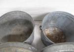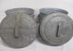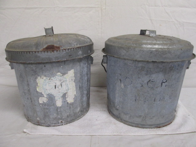 This pair of small, 13"H galvanized trash/ash cans with lids are in used condition. Please preview.