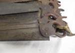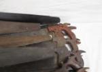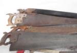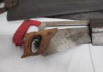 This large collection of vintage saws includes nine hand saws, several from the Disston Co., three hack saws and one bow saw. The hand saws feature beautiful wooden handles, some with intricate designs. These items are in vintage, used condition. Please preview.