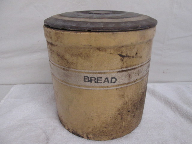 This nice antique 10" bread crock with lid has minor cracks, crazing to the glazing and a family large chip on the lid. This item is in antique, used condition. Please preview.
