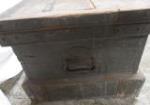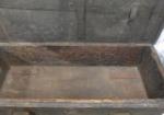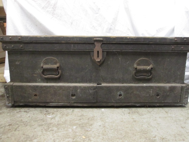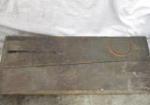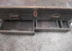 This large, vintage wooden toolbox measuring 37"W X 15"D X 14"H is in used condition and has some wear due to age and use. Please preview.