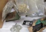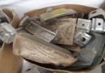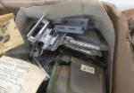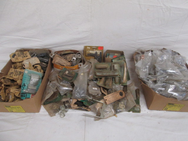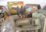 This large box of miscellaneous tools, dry wall materials and hardware includes support brackets, cabinet hinges, door catches, drawer handles, drawer pulls, clothes hooks and more. These items are in new and used good condition however they will need a good cleaning due to dust from storage. Please preview.
