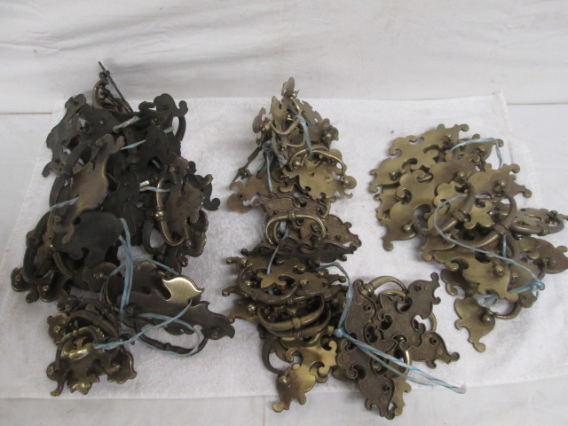 This lovely, large collection of over sixty colonial style drawer handles are two different sizes. These items are in good condition. Please preview.