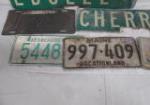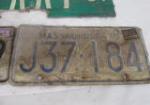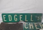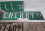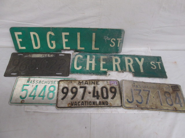 Collection of four vintage license plates, one from the state of Maine, the other three are Massachusetts license plates. Also included are two street signs featuring a street sign from Cherry Street, and a street sign from Edgell Street. These items are in used condition. Please preview.