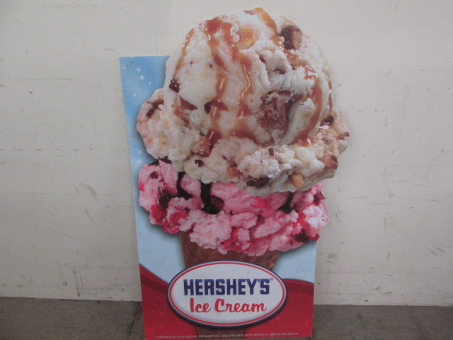 This very large vintage cardboard, advertisement sign for Hershey’s ice cream features a giant ice cream cone with multiple ice cream flavors and toppings. This item measures 30“ x 48“. This item is in vintage, good condition. Please preview.