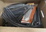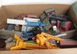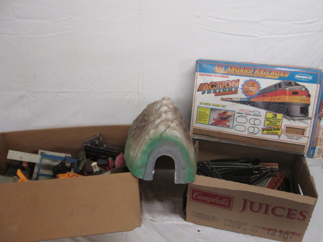This large collection of items from a HOH and N scale model train set, includes train tracks a tunnel through a mountain, farms, oil, wells, equipment, and other buildings. These items are in vintage, good condition. Please preview.