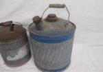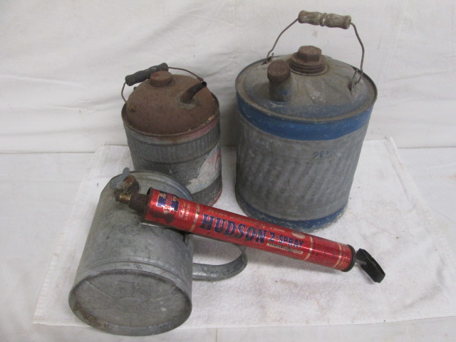 This assortment of vintage galvanized items include a kerosene can, specifically a "Highest Grade POLO" 1 Gallon Kerosene can by Winfield Manufacturing Co., a vintage Hudson 2-Spray pump sprayer, likely from the 1950's., a vintage "Old Ironsides" galvanized metal gas can, potentially used for kerosene and other fuels. These items are in vintage, good condition. Please preview.