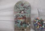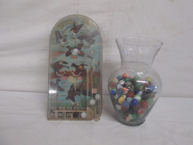 Take a walk down memory lane with this half jar of marbles and a 9" "Wing Shot" hand held pinball machine. These items are in good condition. Please preview.