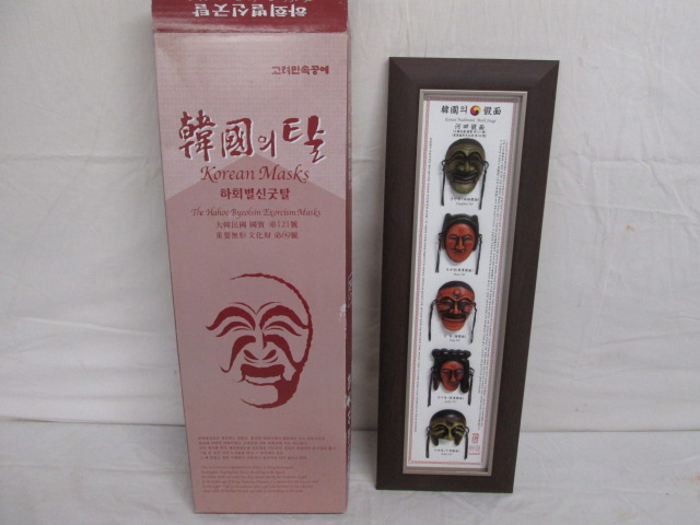 This interesting wall hanging featuring five Korean exorcism masks measures 22” x 7”. This item is in new condition. Please preview.