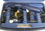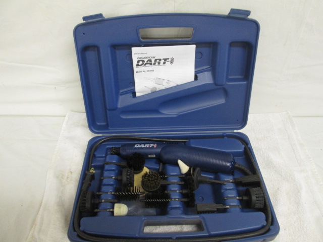 This Chamberlain brand Dart dual action, rotary reciprocating tool (model number DT 2000) is in its carrying case. Accessories for this tool include a round soft bristle brush, a straight soft bristle brush a wheel shaped soft brush bristle brush, a 2" rotary sander, a 2" felt buffer and more. This item is in good condition. Please preview.